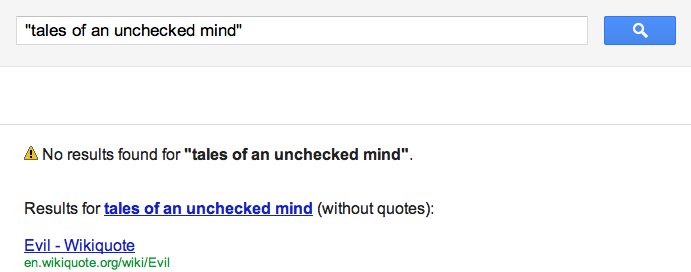 In it, I spontaneously came up with the phrase “Tales of an unchecked mind”, which is both a cheesy tagline and perfect for a blog, but more importantly at the time of writing had ZERO results on Google when the exact phrase was entered!