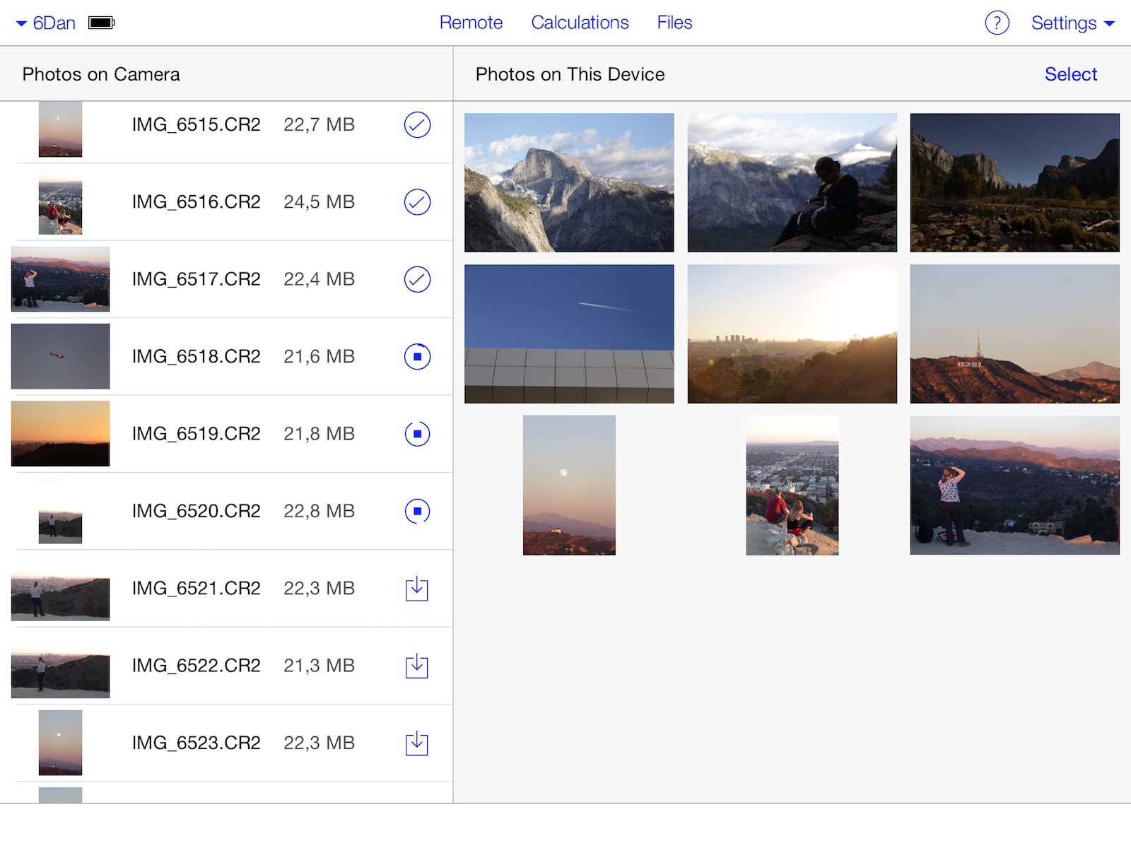 Downloading photos from a WiFi-enabled SLR in an early build of my app.