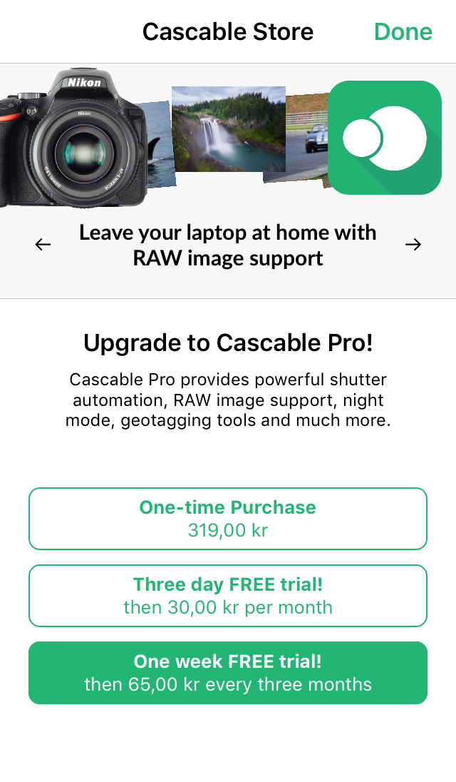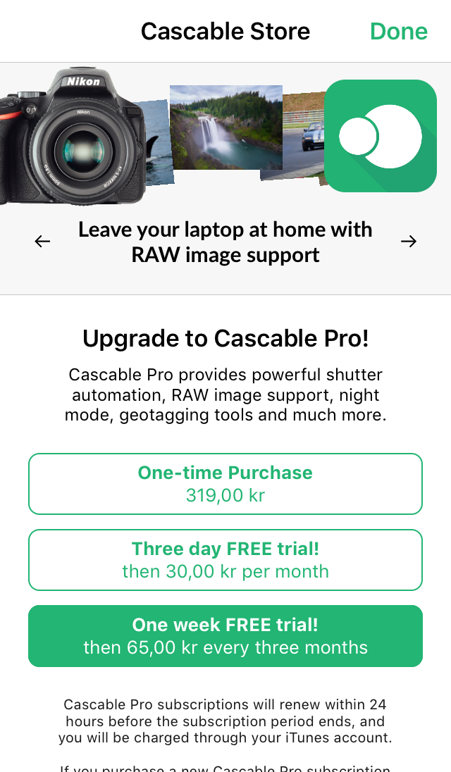 Install the free version of Cascable on two devices with the same Apple ID. Purchase a subscription on the first device, then purchase a different subscription on the second without doing a “Restore Purchases”. Tada! Two subscriptions. ↩
