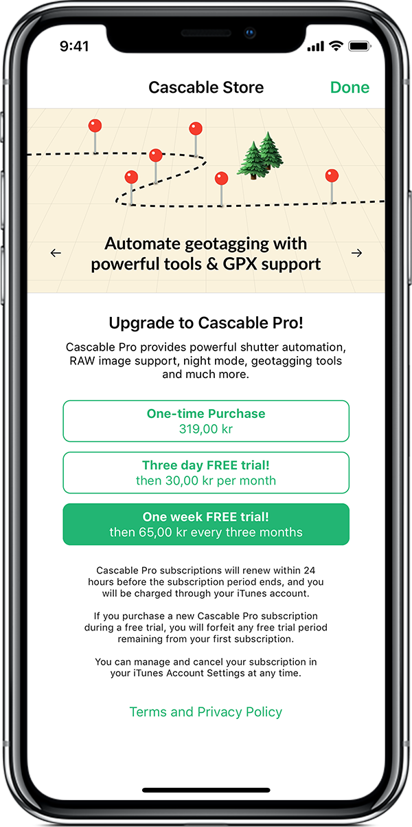 Here we can see my store page on an iPhone X, which is big enough to display everything without scrolling. The legalese paragraphs and Terms/Privacy buttons are visible here.