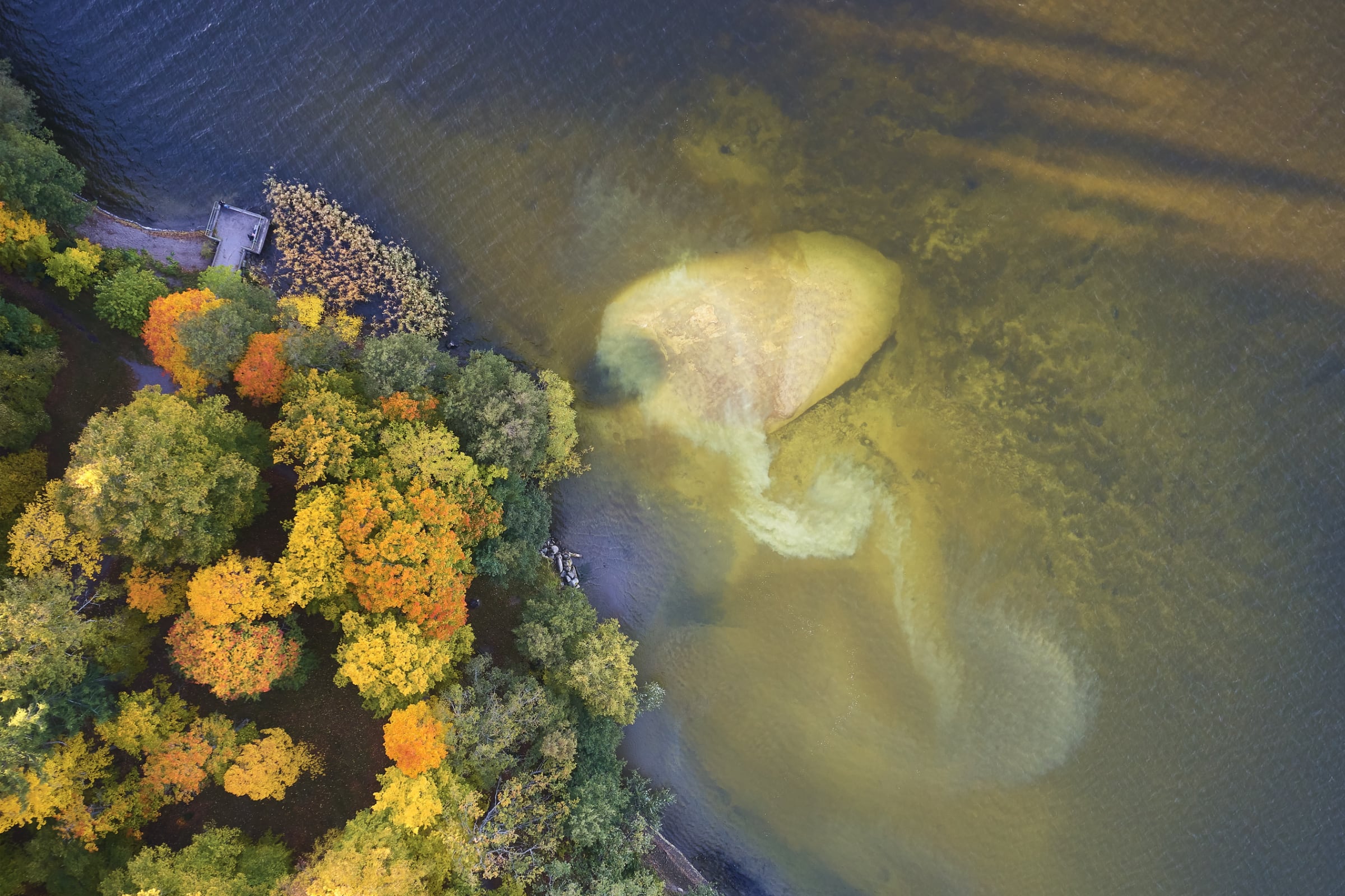 The slow currents of Mälaren disturb mud around an underwater rock.